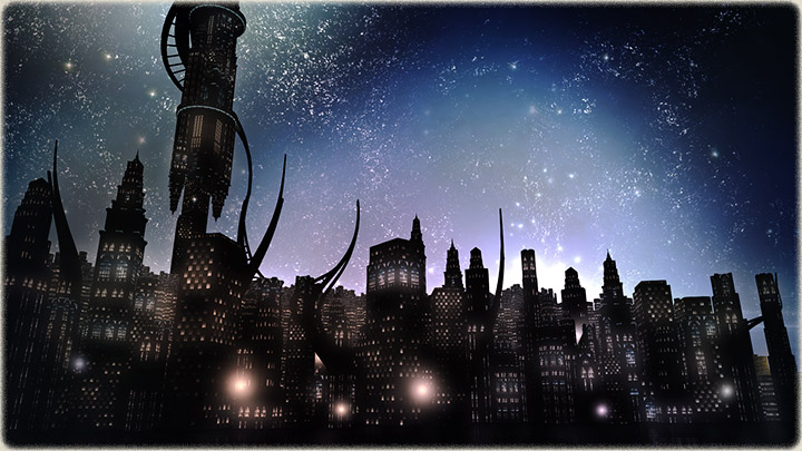 the more pressing matter, however, is where they are. as soon as he gets the chance to glance over their surroundings-- he just stops short and ignores them, looking up to the taller buildings, then wanders nearer to the closest one to touch it, as if making sure it's actually solid.]